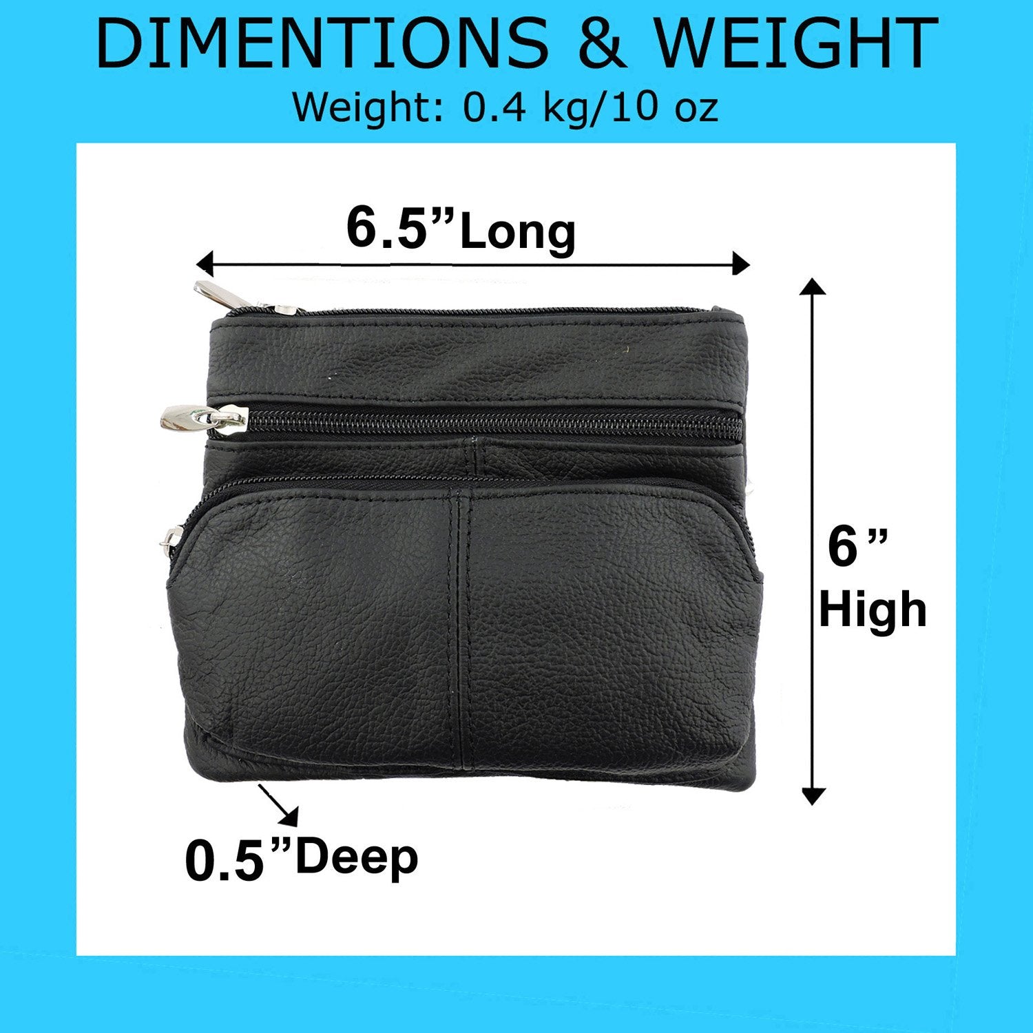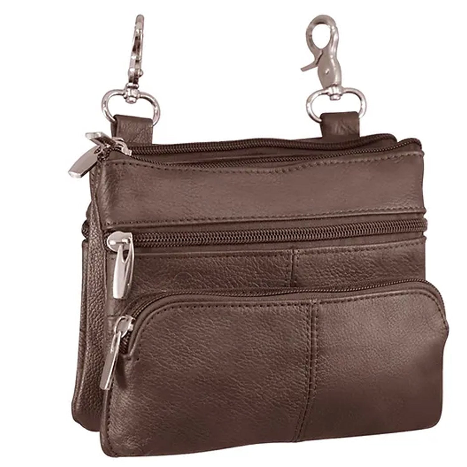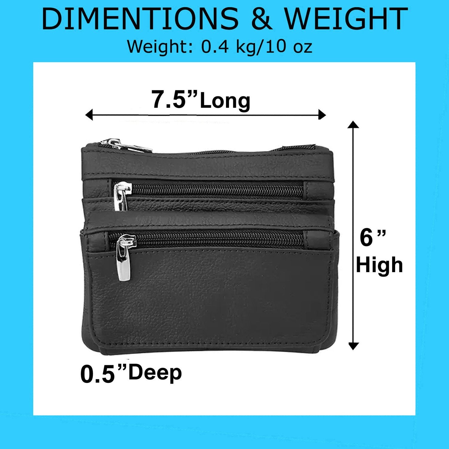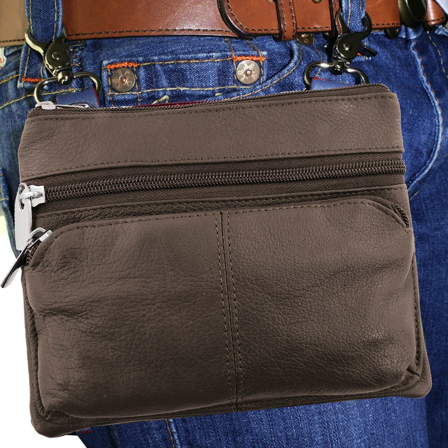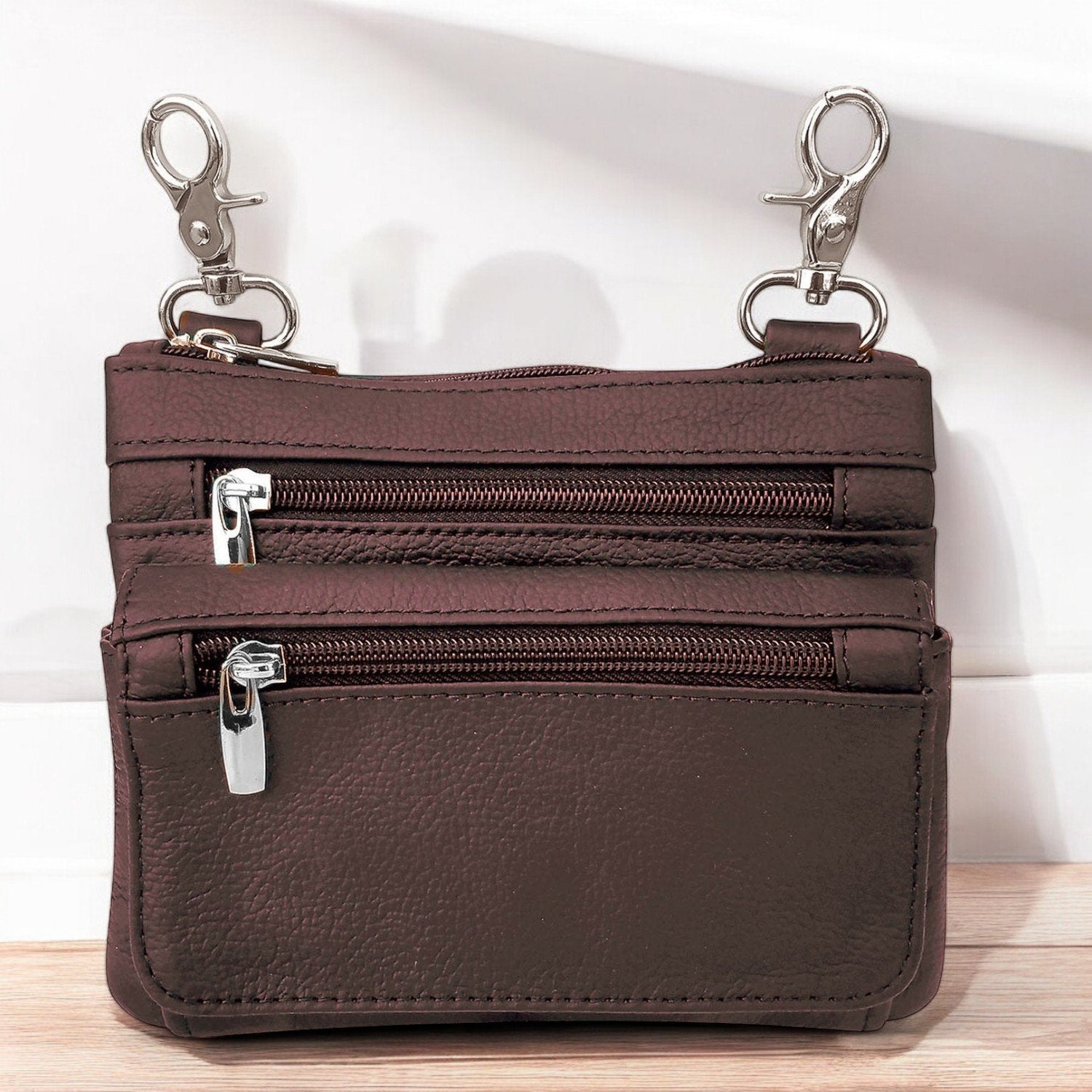 Compact Size: Measures 7½" x 6", perfect for keeping your essentials within reach without the bulk.Durable Cowhide Leather: Made from high-quality cowhide leather for lasting durability and style.Adjustable Shoulder Strap: Versatile strap connects to belt loop clips, adjustable for a comfortable fit.Quick Access Overflap: Front side features an overflap for easy access to frequently used items.Two Exterior Zipper Pockets: Additional storage for small items like cards, cash, or keys.Share