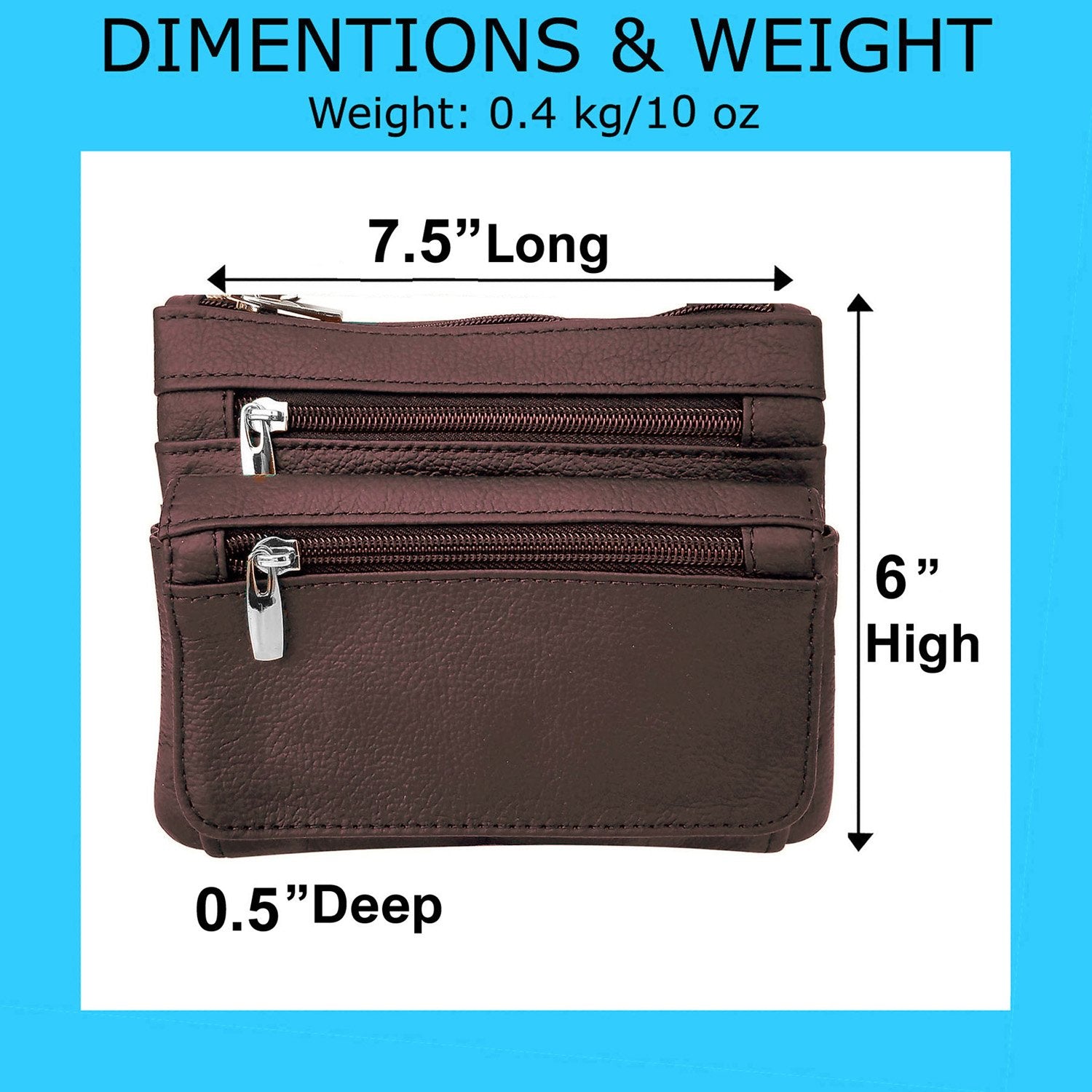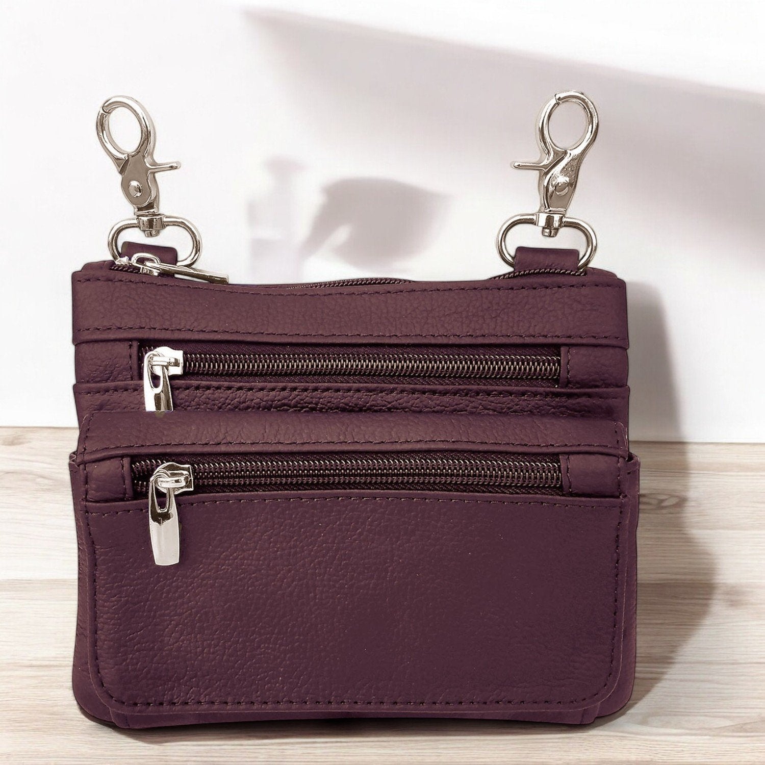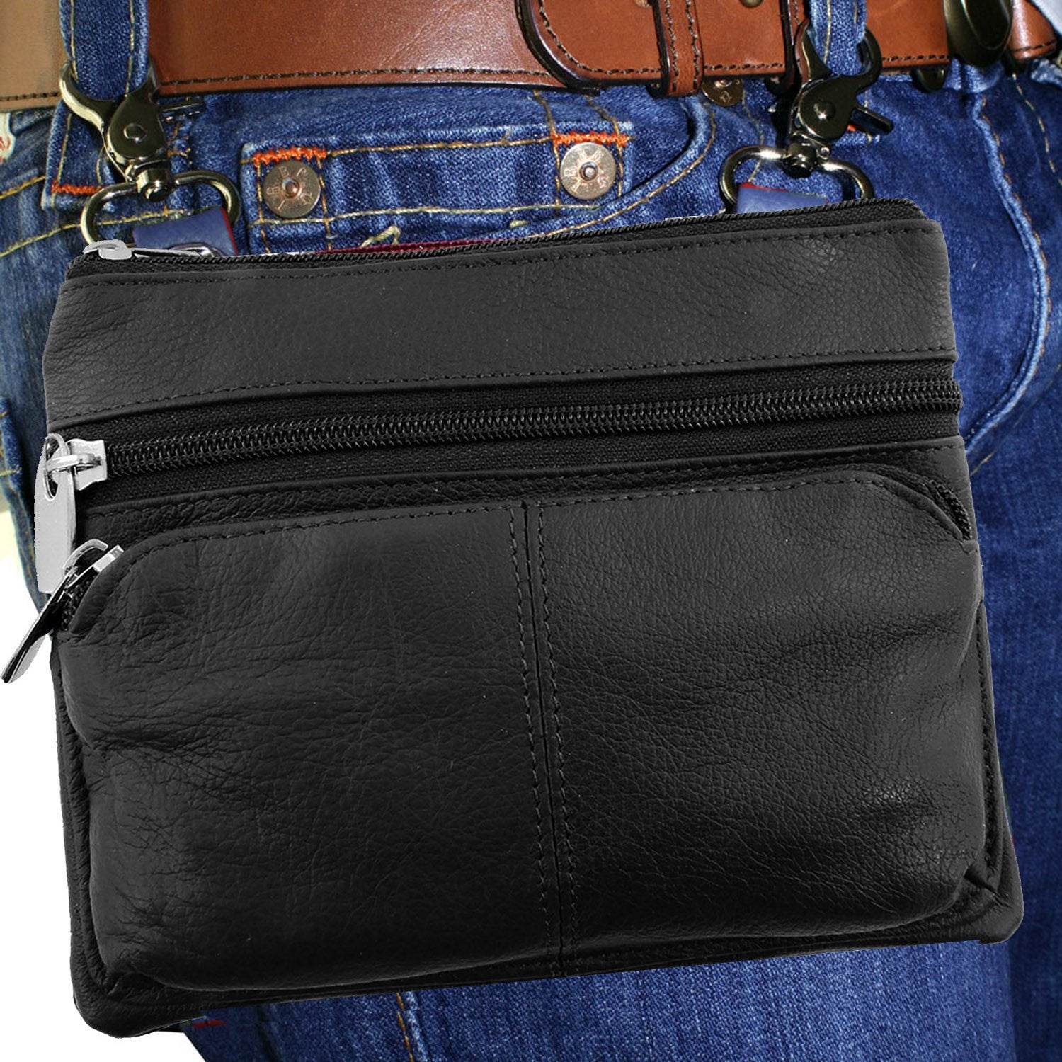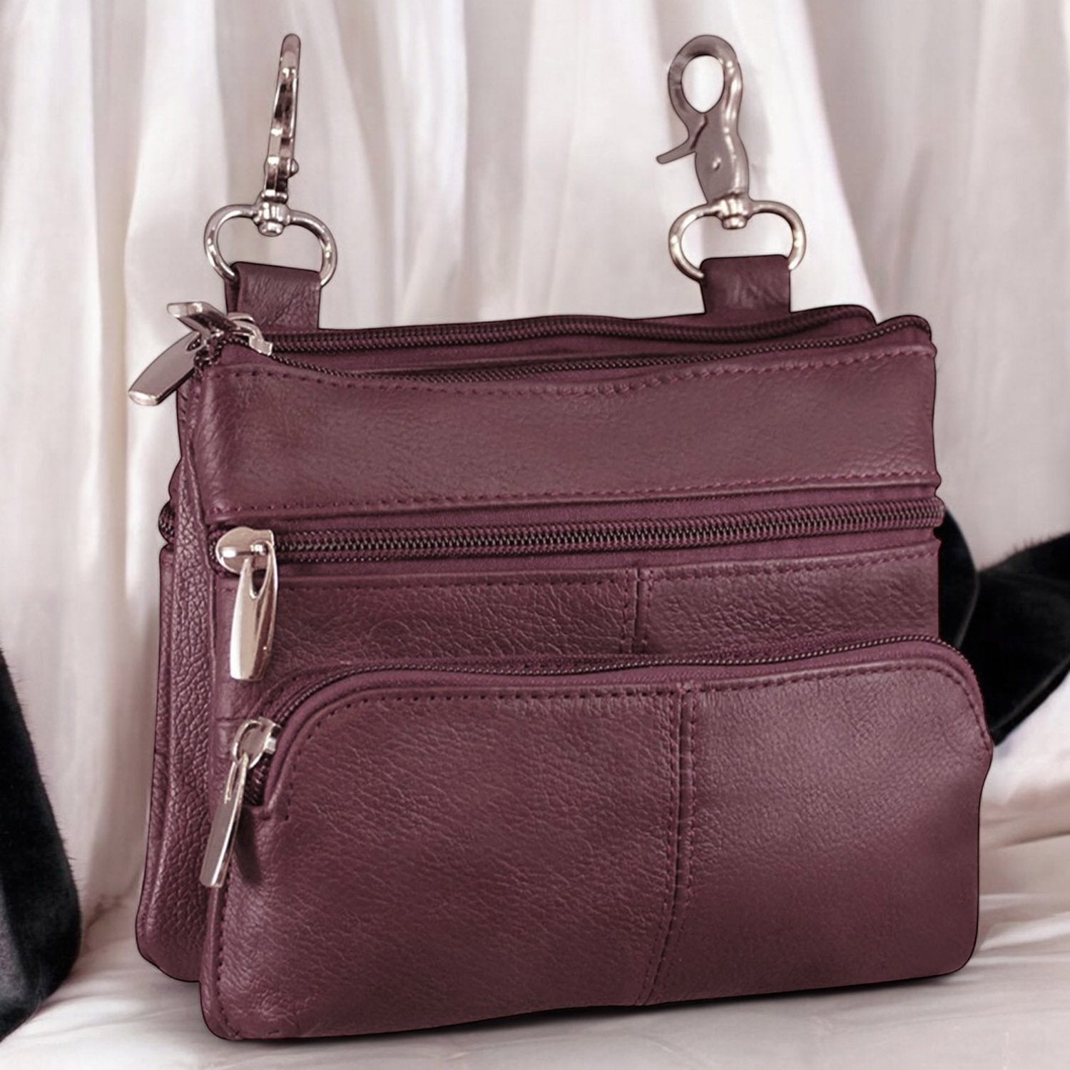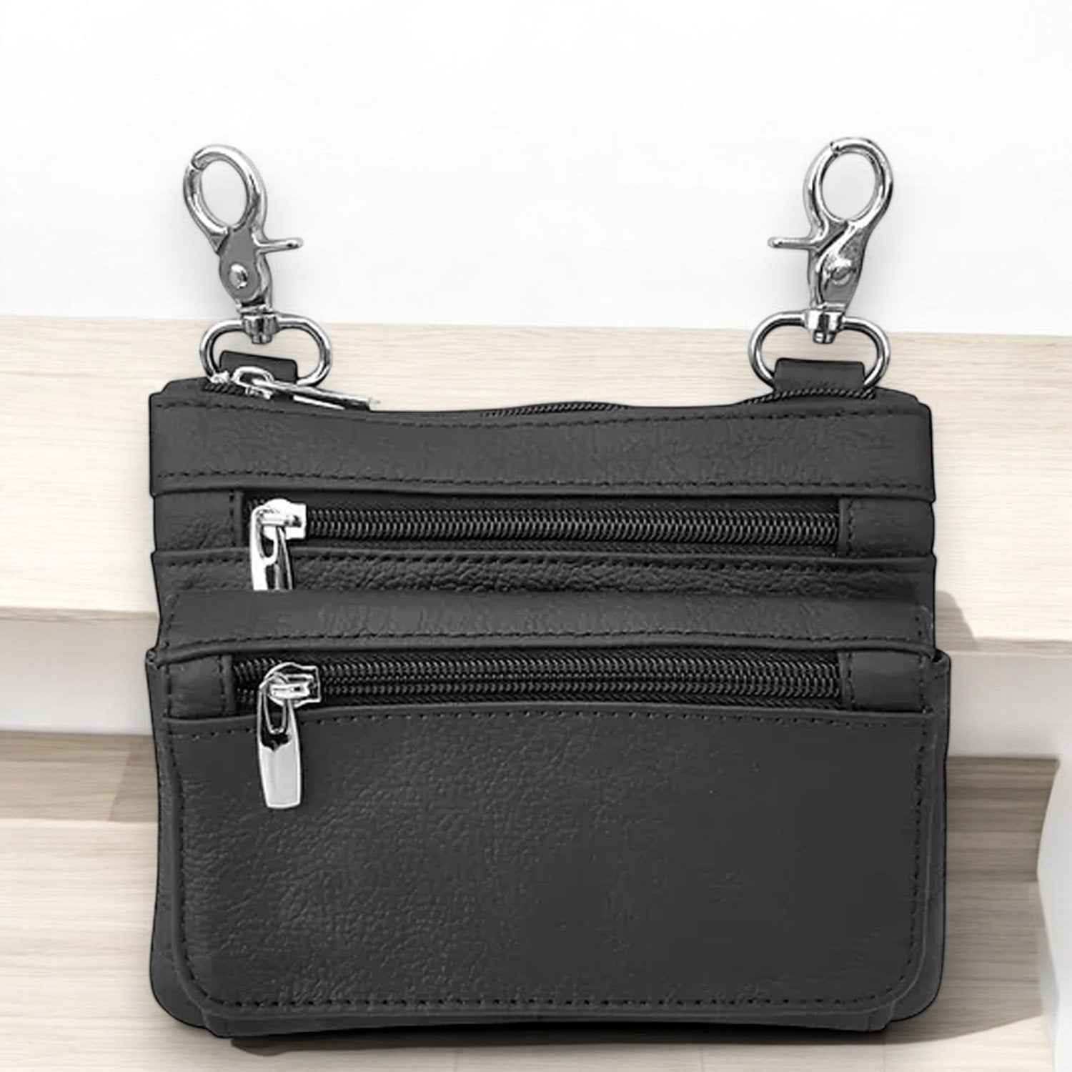 Compact Size: Measures 7½" x 6", perfect for keeping your essentials within reach without the bulk.Durable Cowhide Leather: Made from high-quality cowhide leather for lasting durability and style.Adjustable Shoulder Strap: Versatile strap connects to belt loop clips, adjustable for a comfortable fit.Quick Access Overflap: Front side features an overflap for easy access to frequently used items.Two Exterior Zipper Pockets: Additional storage for small items like cards, cash, or keys.Share