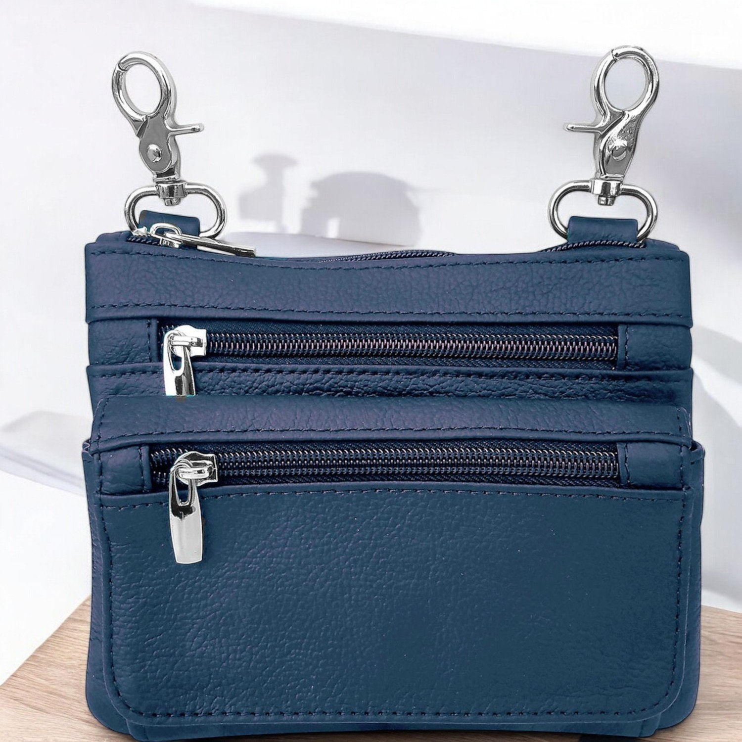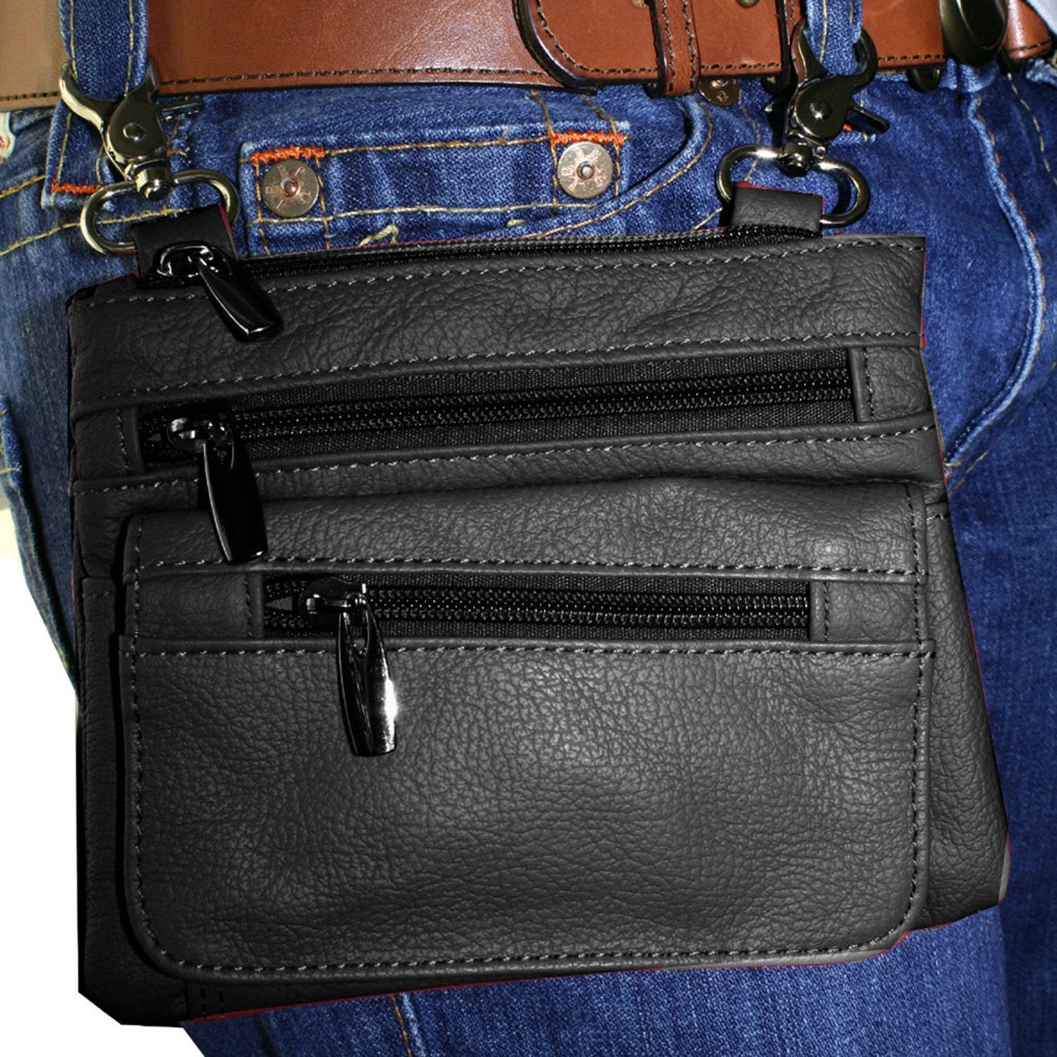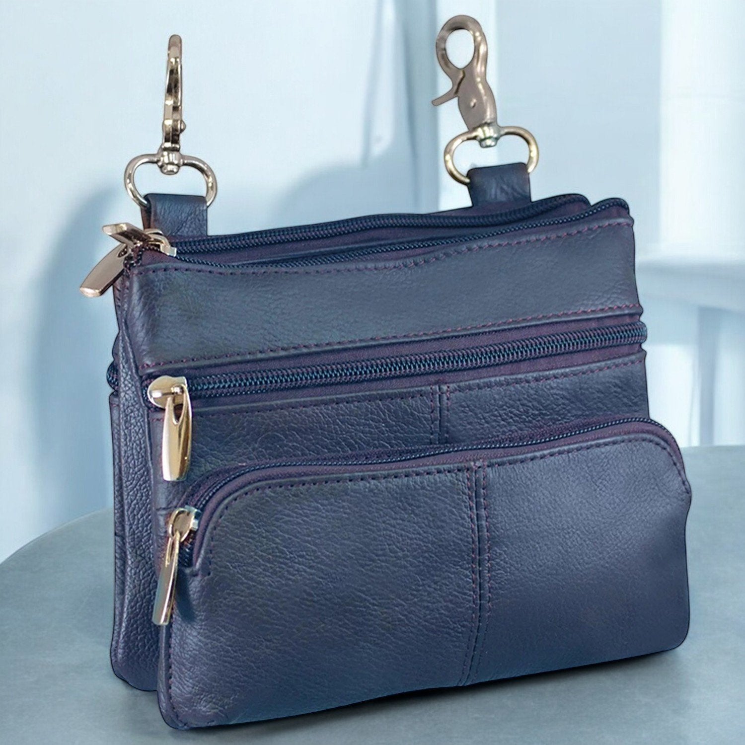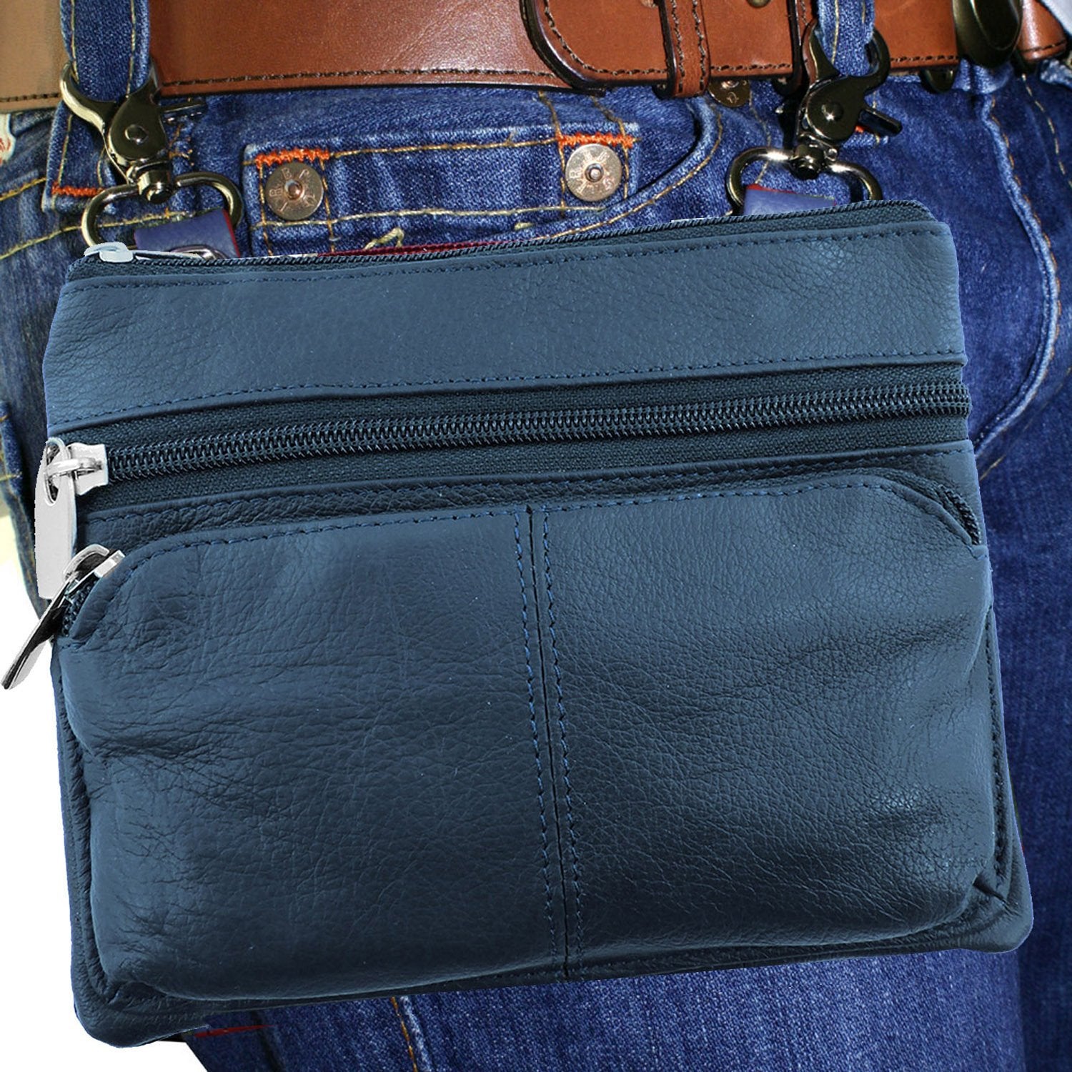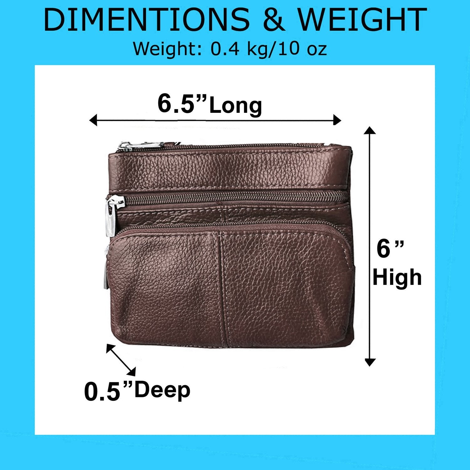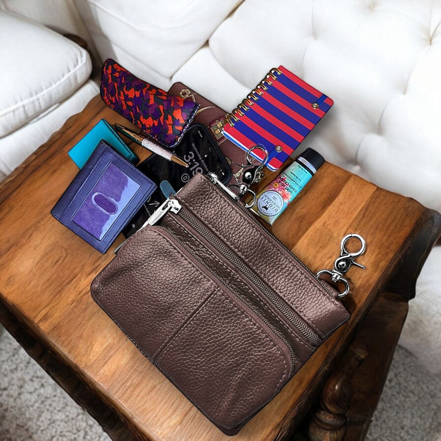 Compact Size: Measures 7½" x 6", perfect for keeping your essentials within reach without the bulk.Durable Cowhide Leather: Made from high-quality cowhide leather for lasting durability and style.Adjustable Shoulder Strap: Versatile strap connects to belt loop clips, adjustable for a comfortable fit.Quick Access Overflap: Front side features an overflap for easy access to frequently used items.Two Exterior Zipper Pockets: Additional storage for small items like cards, cash, or keys.Share