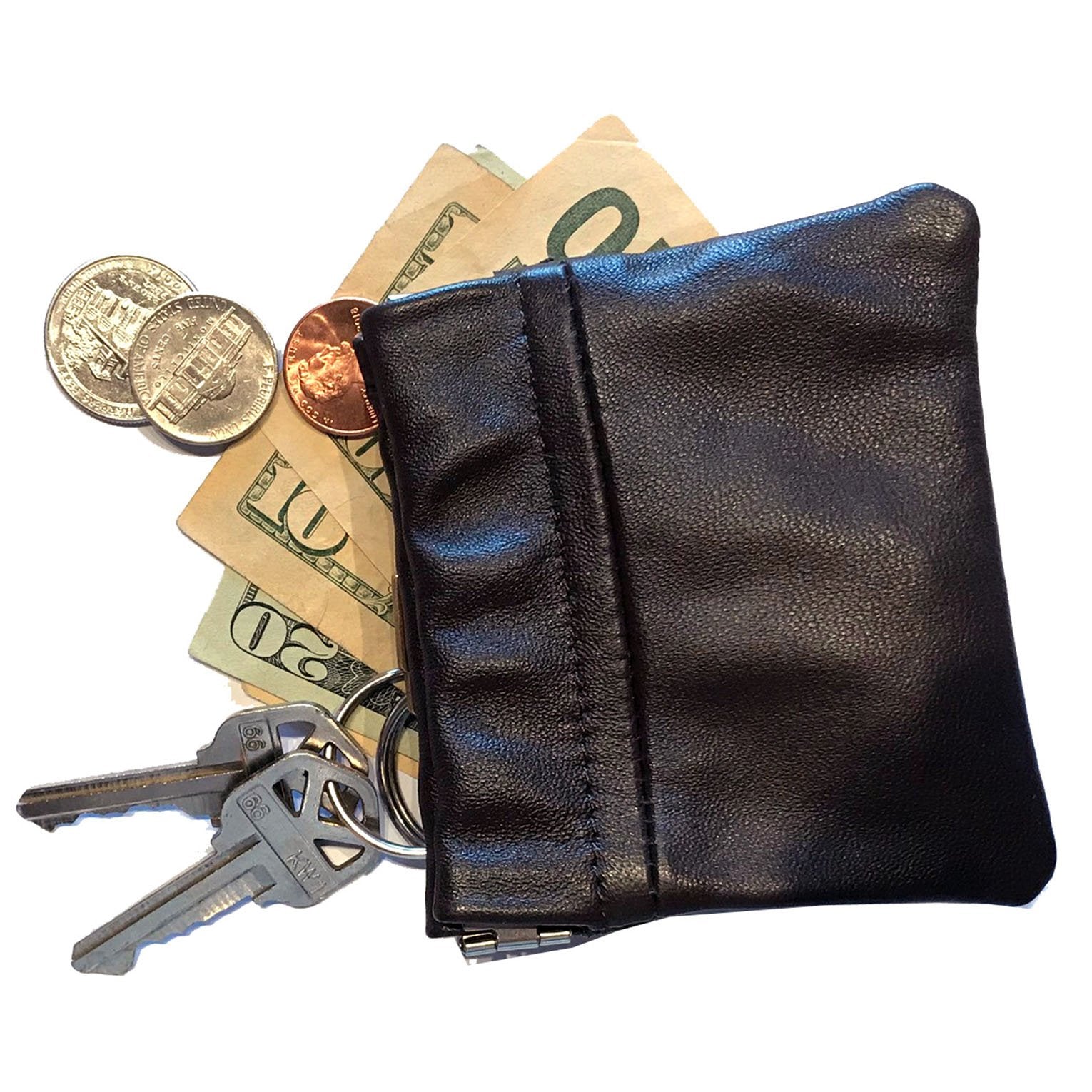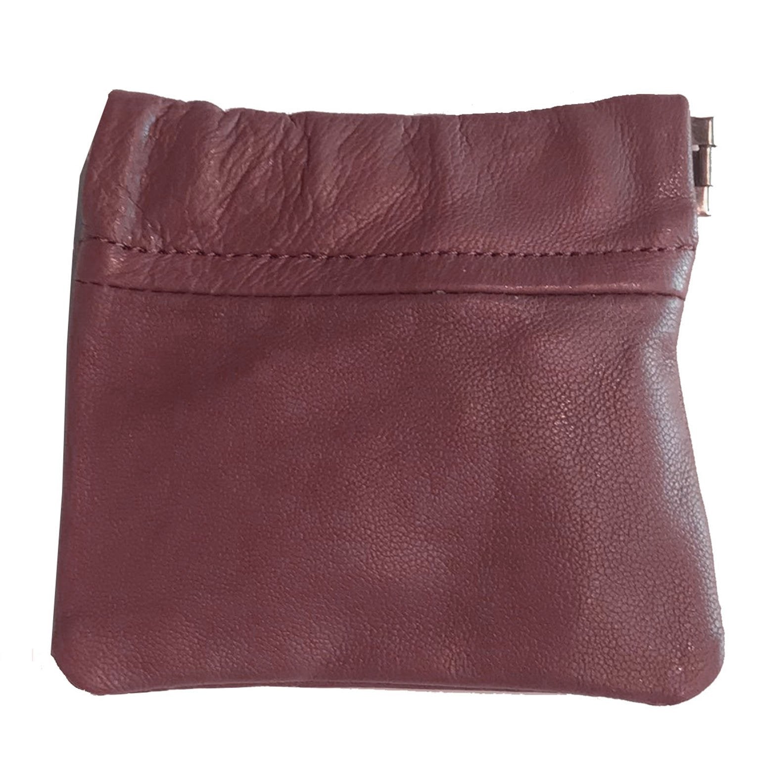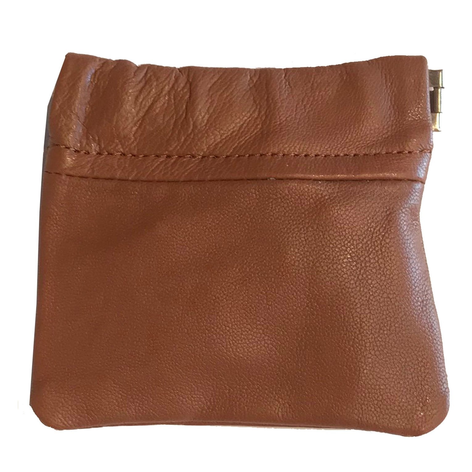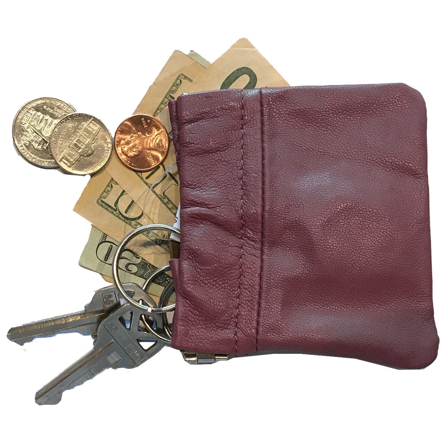 Cowhide Leather Coin Purse Change Holder Squeeze Spring Closure w Key Ring, 3.0" by 3.25"