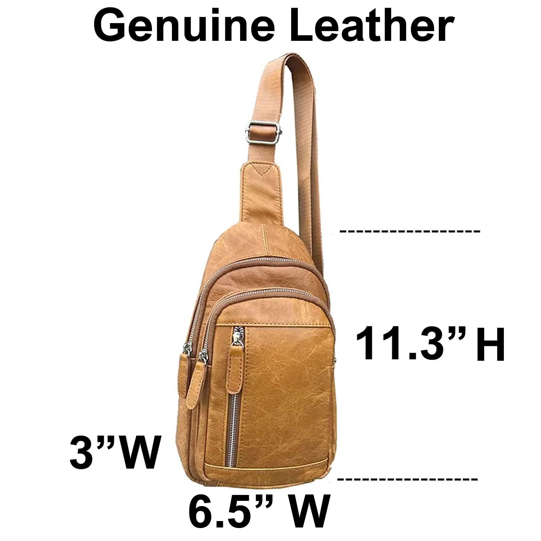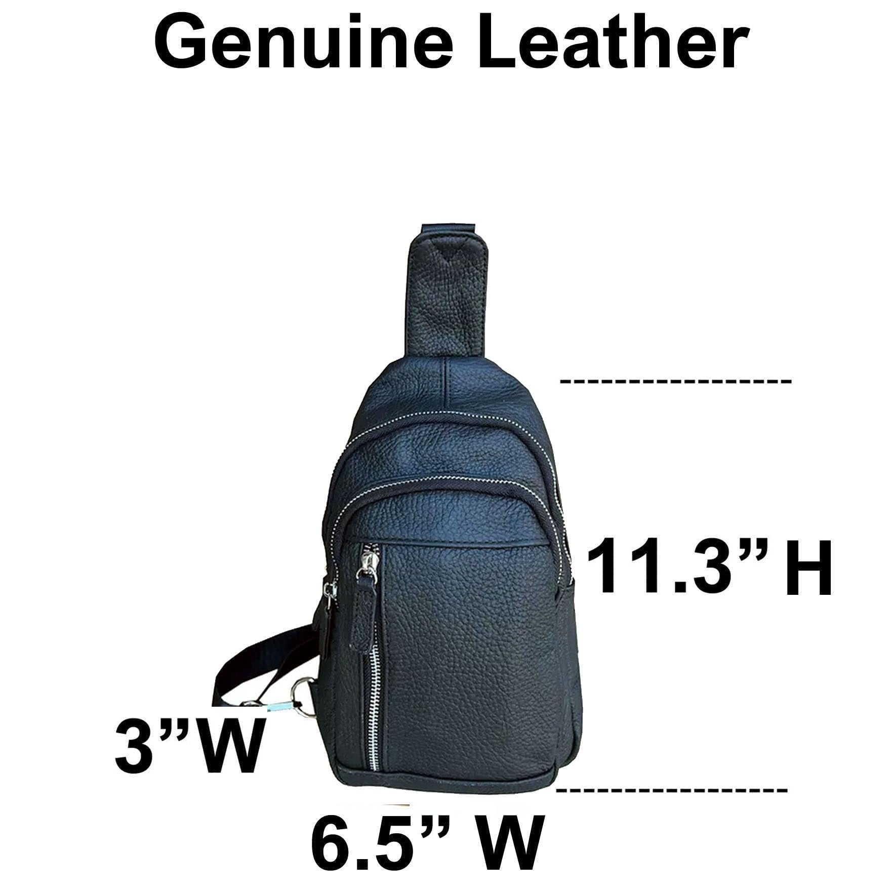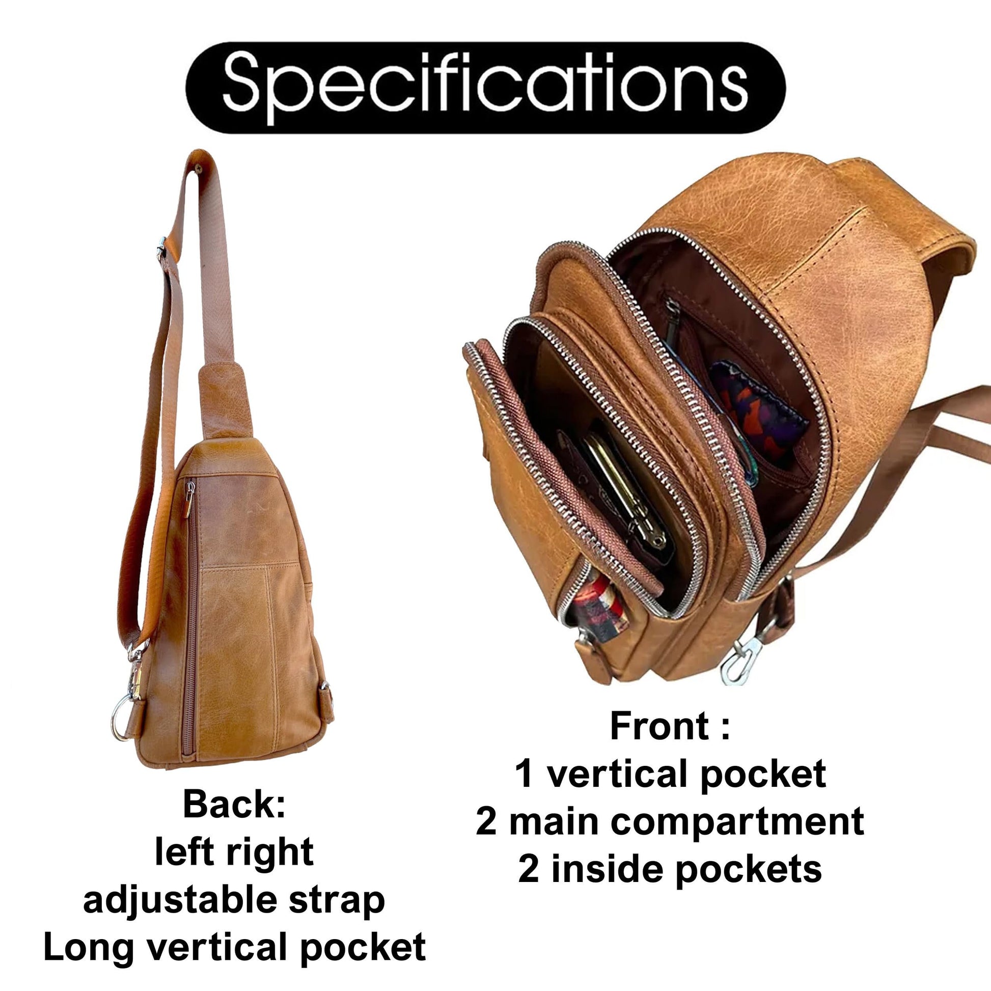 Sling Bag / Compact Backpack has two spacious main compartments, 4 pockets, and an adjustable strap. Not your everage sling bag, our version is made of genuine cowhide and packetd with convinient compart,ents and pockets. Quality zippers with leather pulls and adjustable straps add to its convenience.Will Last: The sling bag is made of genuine cowhide, which has a grain finish. The strap is made of seatbelt strenght nylon.Specifications : 1. 2 main compartments 2. 1 compartment has an interior throw pocket and zippered pocket 3. An exterior front vertical pocket with zipper closure 4. The exterior backside has 1 vertical pocket with zipper closure The handle is 24-48 " adjustable, and also can be switched from left to right with a hoock closure.Size: 11.3"H by 6.5"W by 3" D. Adjustable shoulder strap with left-right options.
