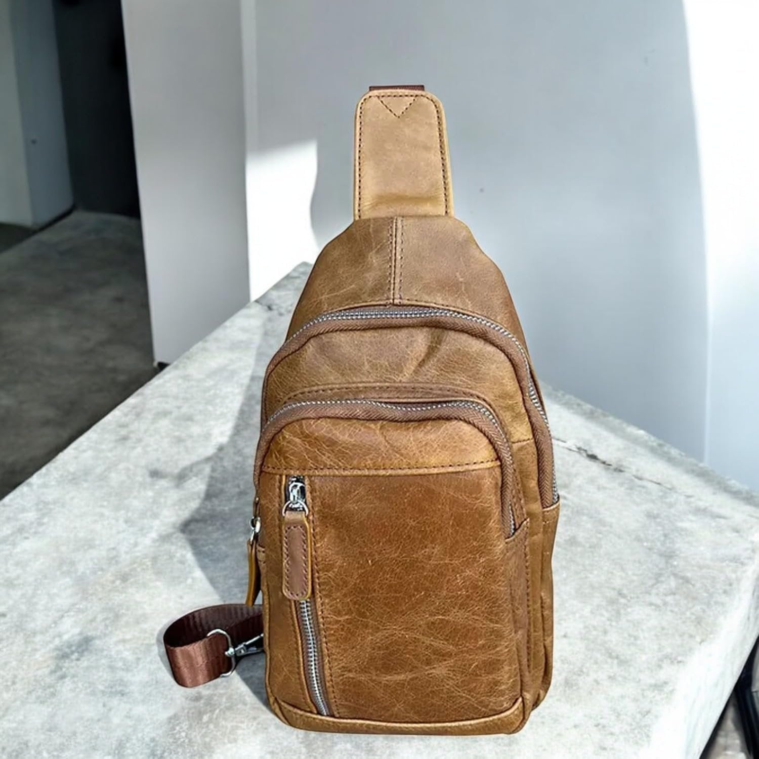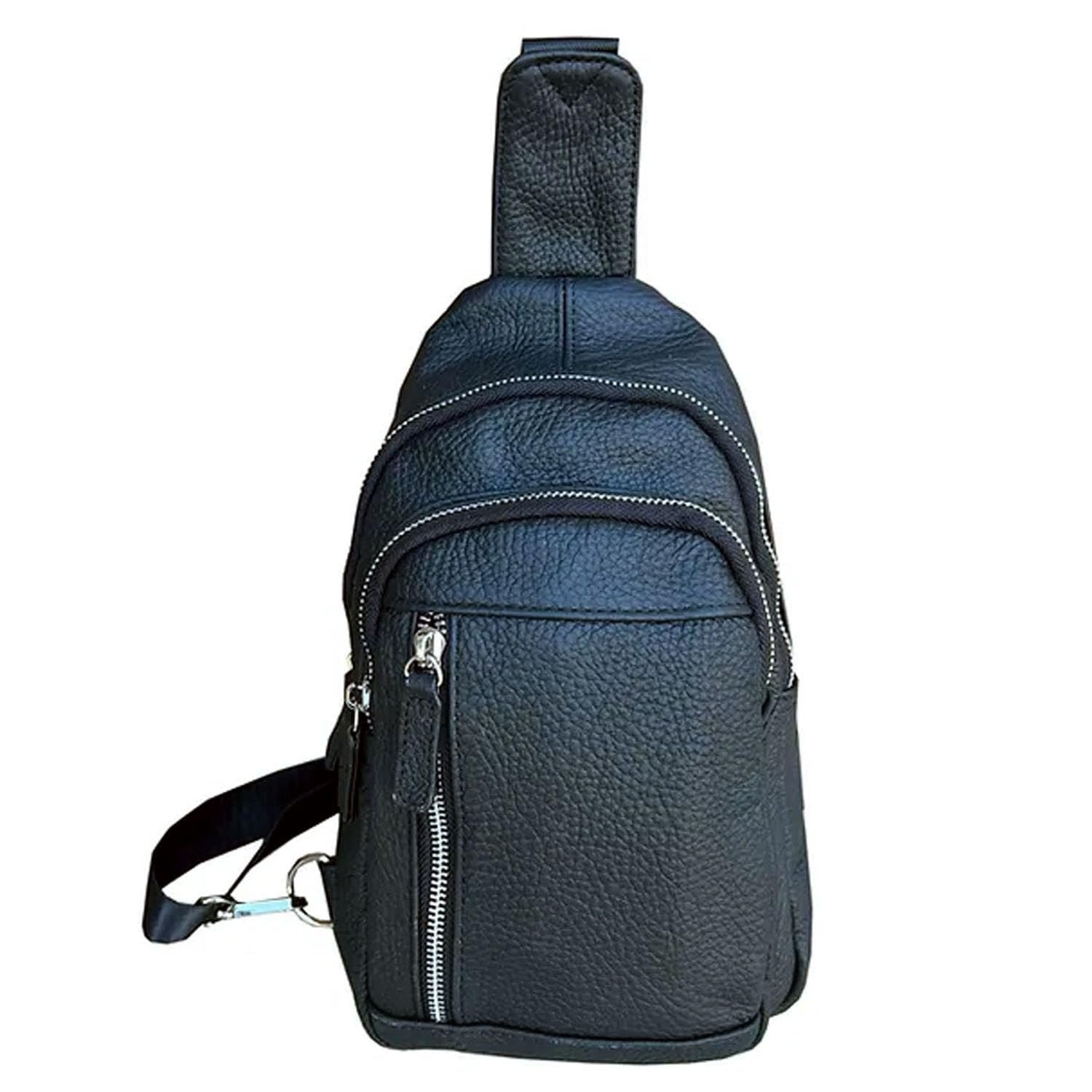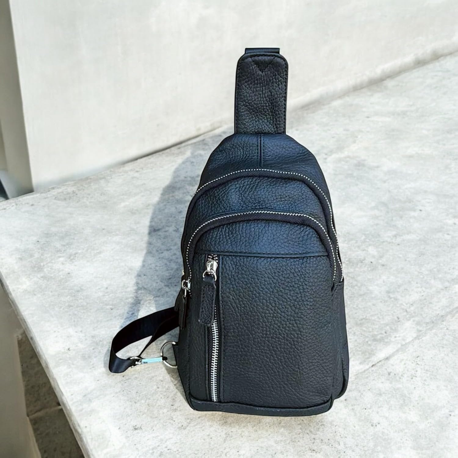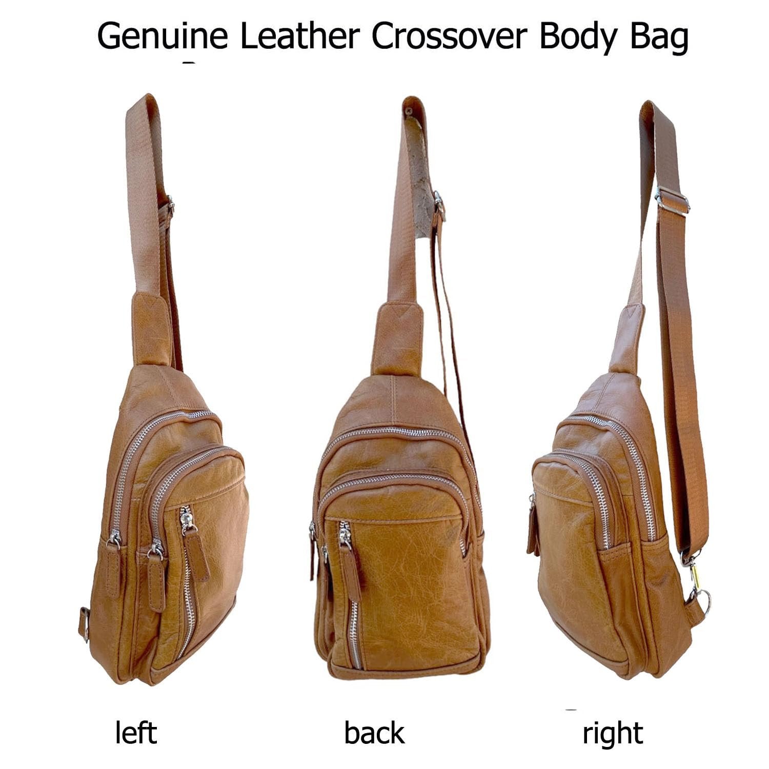 Sling Bag / Compact Backpack has two spacious main compartments, 4 pockets, and an adjustable strap. Not your everage sling bag, our version is made of genuine cowhide and packetd with convinient compart,ents and pockets. Quality zippers with leather pulls and adjustable straps add to its convenience.Will Last: The sling bag is made of genuine cowhide, which has a grain finish. The strap is made of seatbelt strenght nylon.Specifications : 1. 2 main compartments 2. 1 compartment has an interior throw pocket and zippered pocket 3. An exterior front vertical pocket with zipper closure 4. The exterior backside has 1 vertical pocket with zipper closure The handle is 24-48 " adjustable, and also can be switched from left to right with a hoock closure.Size: 11.3"H by 6.5"W by 3" D. Adjustable shoulder strap with left-right options.
