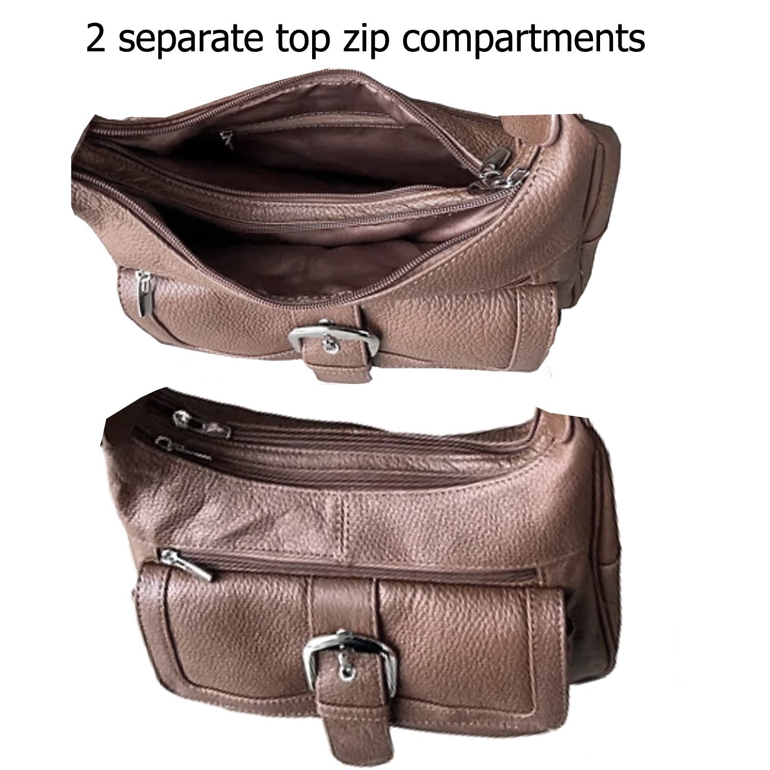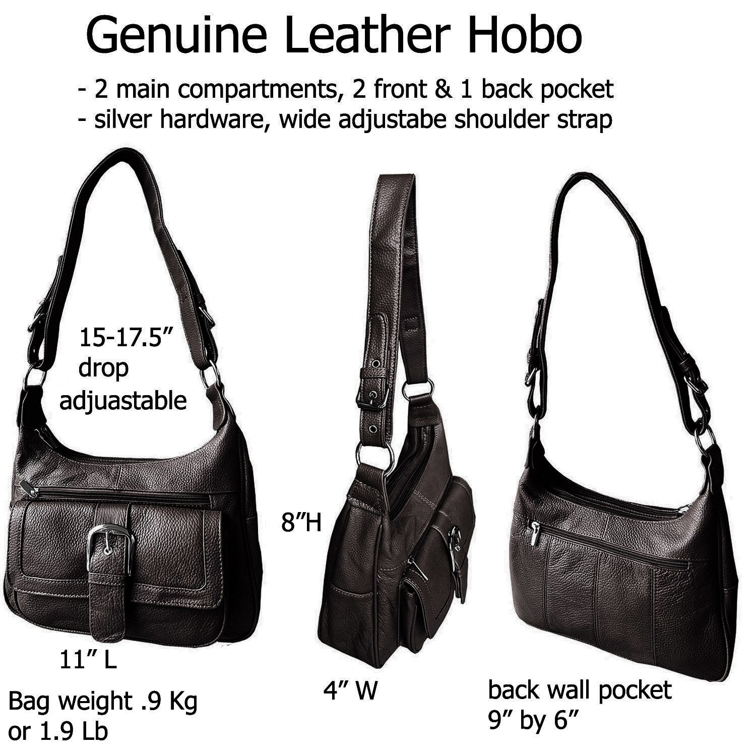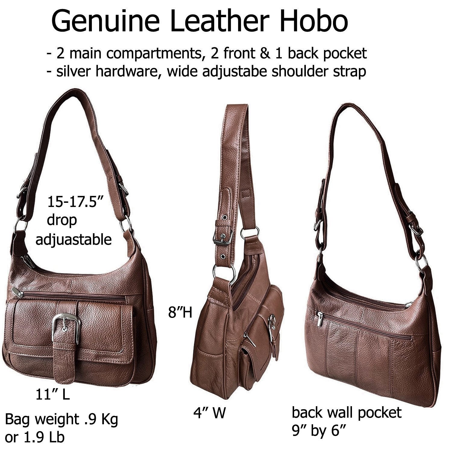 Size: 11’’x 10’’x 3’’Made of genuine cowhide leather and decorated with silver hardware.Genuine LeatherSize: 11’’x 8’’x 3’’, 17" Adjustable Strap 15-17.5" drop2 of the Top Zippered Closures open up 2 separate compartments. The compartment closer to the back wall has a zippered compartment "divider" and a large zippered pocket.Back wall has a large zippered pocket.The front is decorated with a wide flip-over buckled magnetic closure pocket and a deep gusset zippered pocket