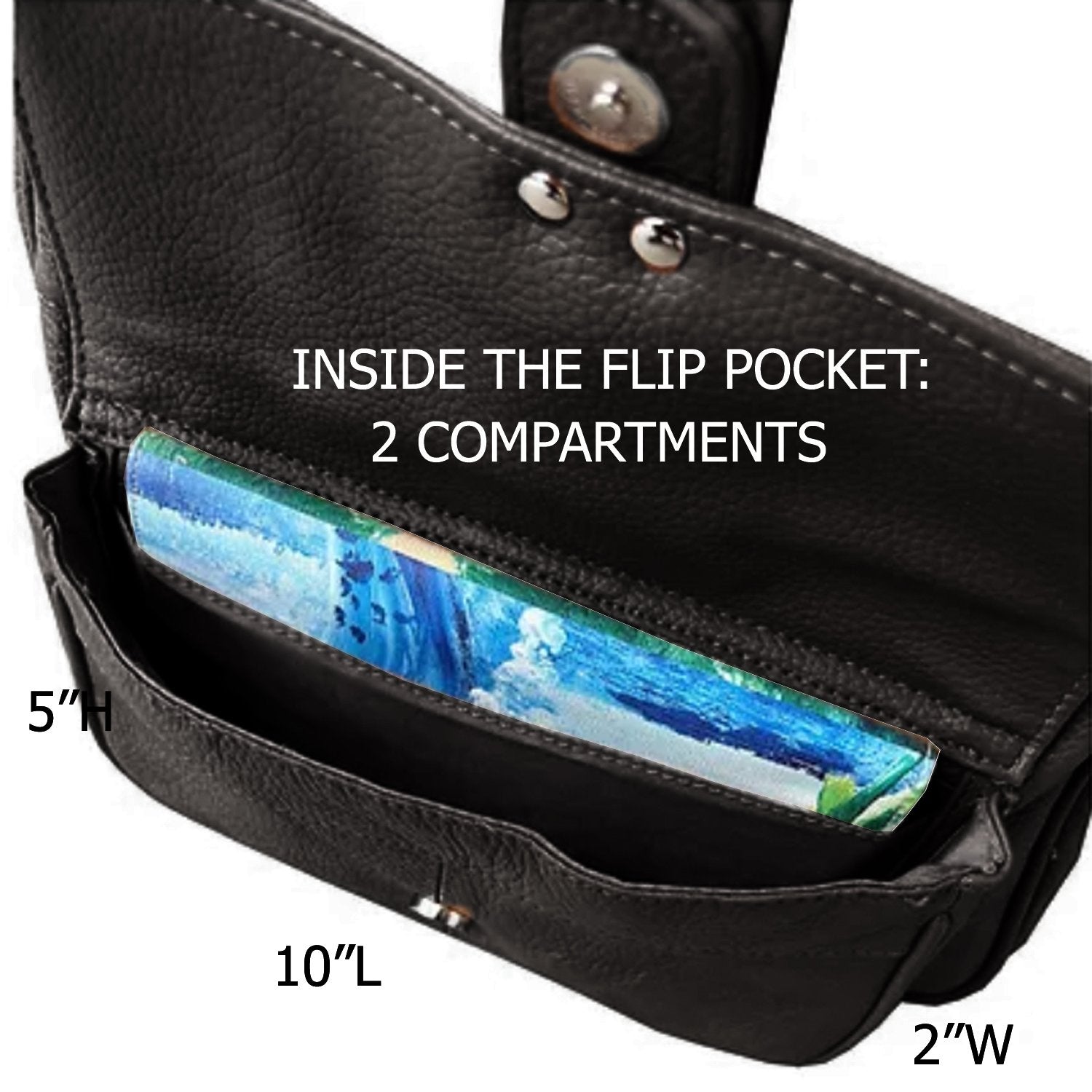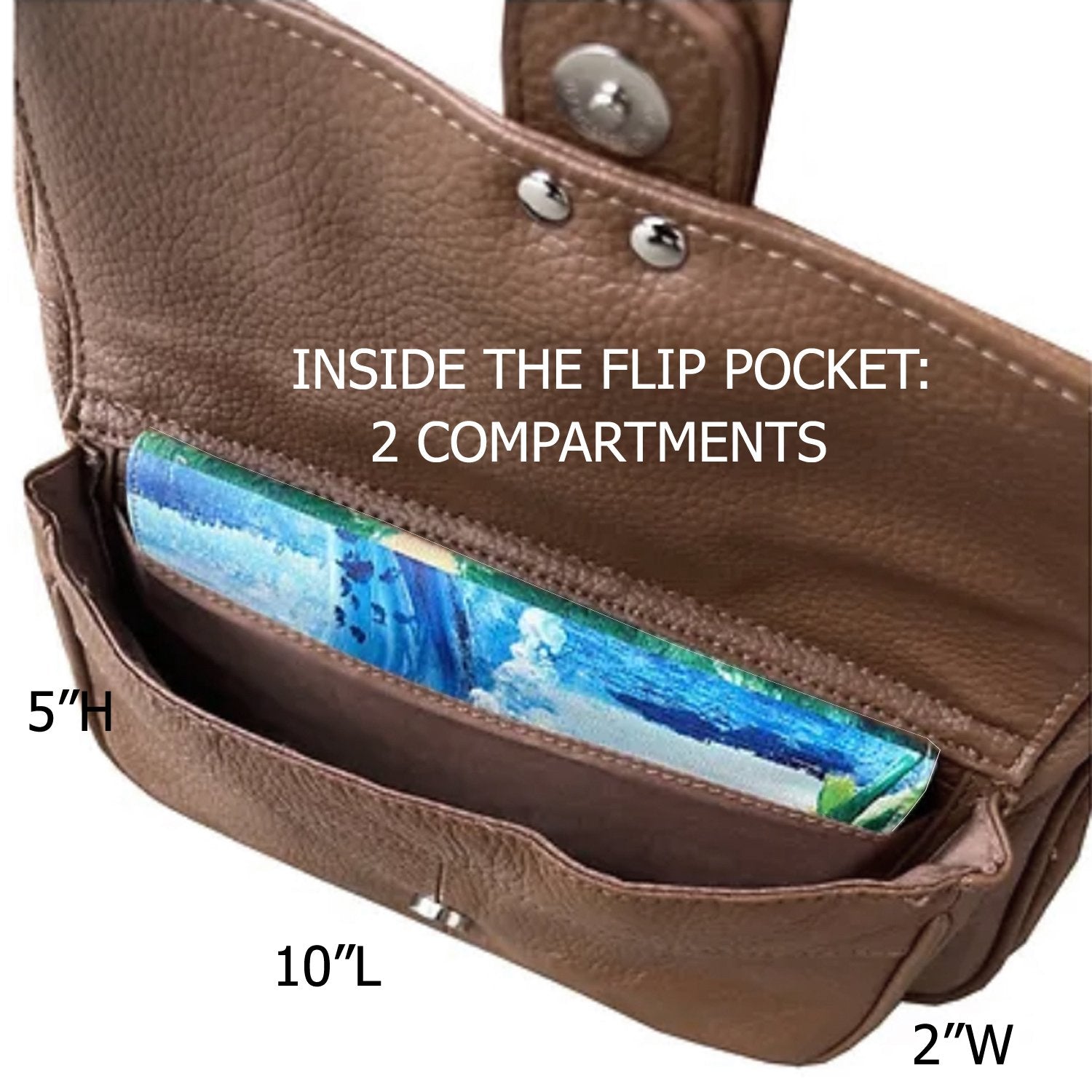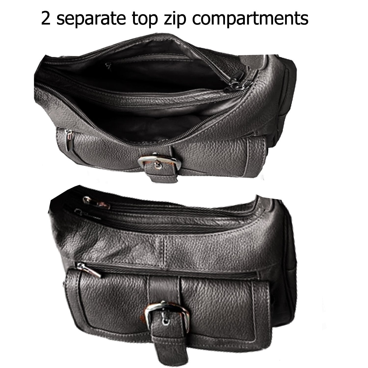 Size: 11’’x 10’’x 3’’Made of genuine cowhide leather and decorated with silver hardware.Genuine LeatherSize: 11’’x 8’’x 3’’, 17" Adjustable Strap 15-17.5" drop2 of the Top Zippered Closures open up 2 separate compartments. The compartment closer to the back wall has a zippered compartment "divider" and a large zippered pocket.Back wall has a large zippered pocket.The front is decorated with a wide flip-over buckled magnetic closure pocket and a deep gusset zippered pocket
