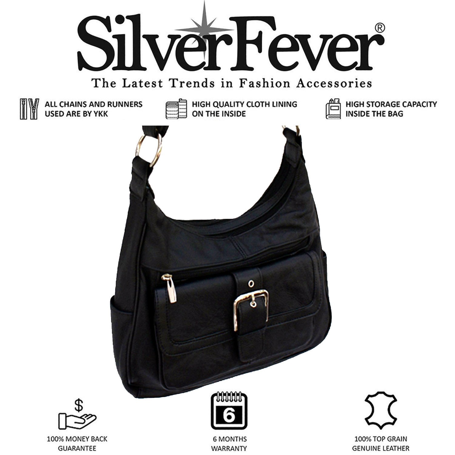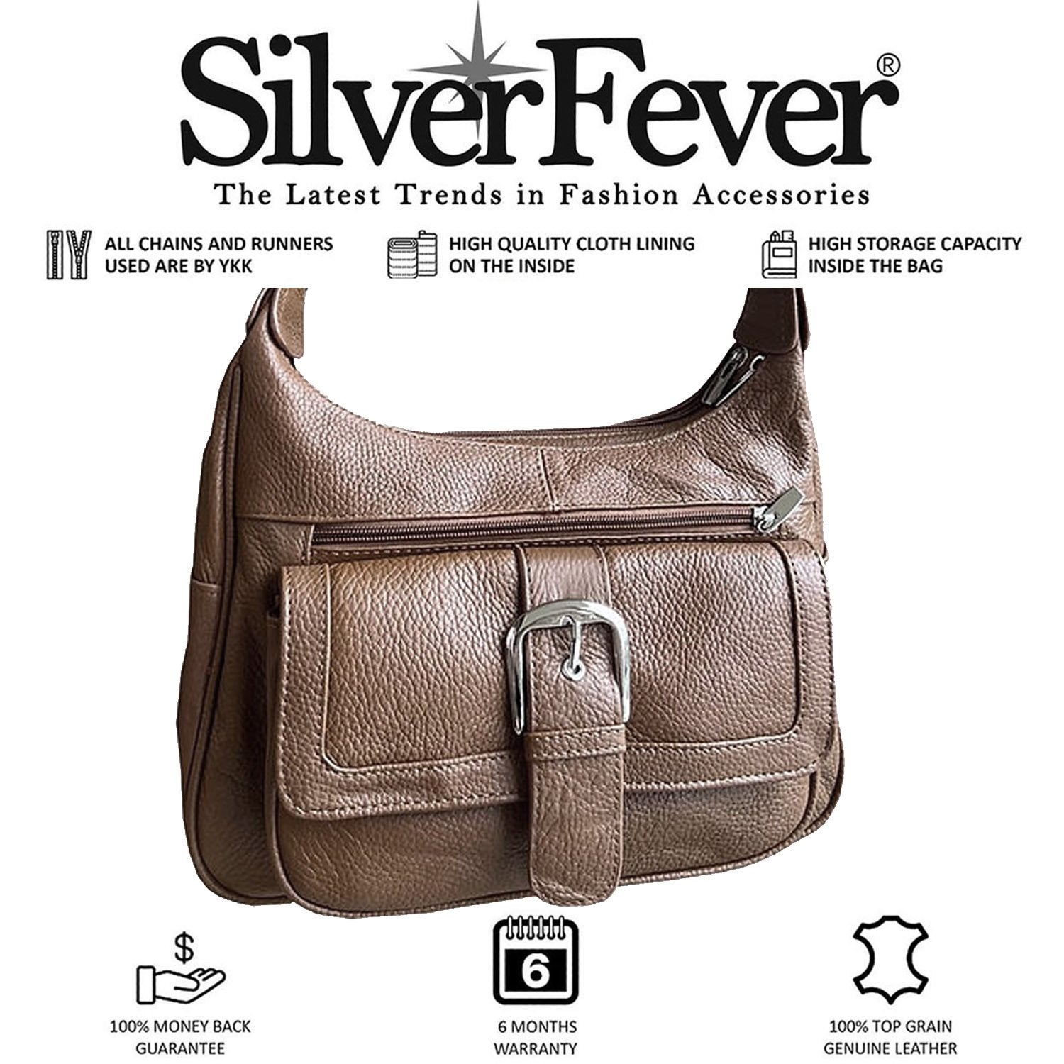 Women's Hobo Leather Handbag with 2 Entry, Buckled Front Pocket Silver Fever